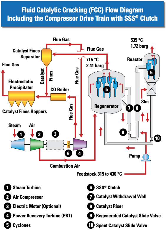The FCC drive train includes a Power Recovery Turbine (PRT) which recovers energy from the flue gas from the FCC process to deliver all or most of the power required to drive the compressor providing air for the fluidized bed in the FCC reactor. The turbomachinery drive train includes a 23MW size 140T Encased SSS Clutch operating at 3600 rpm arranged as - PRT Expander - SSS Clutch - Axial Air Compressor - Steam Turbine (see below).